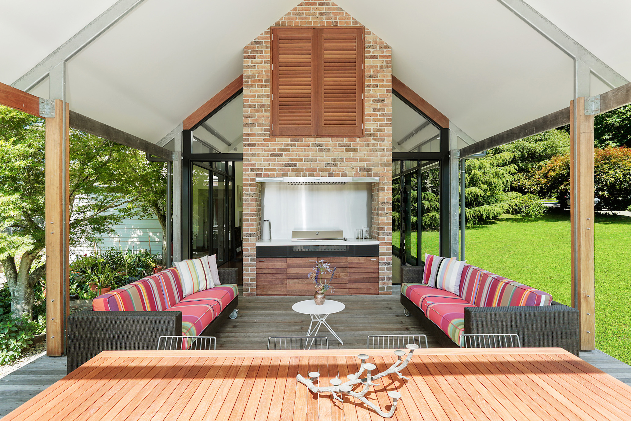 To start, the existing deck and pergola were demolished, keeping the materials for future use. Then we poured the concrete and installed the steel portal frames. The next step was building the large traditional brick fireplace to be the focal point of the room. The construction of this kind of structures is somewhat of dying art form, so we wanted to get it right, which is why we employed experienced bricklayers to construct the seven-meter tall megastructure in this living area. lastly, our team worked hard and came up with innovative ways to install the full height windows and doors that essentially functioned as the walls of the main addition.